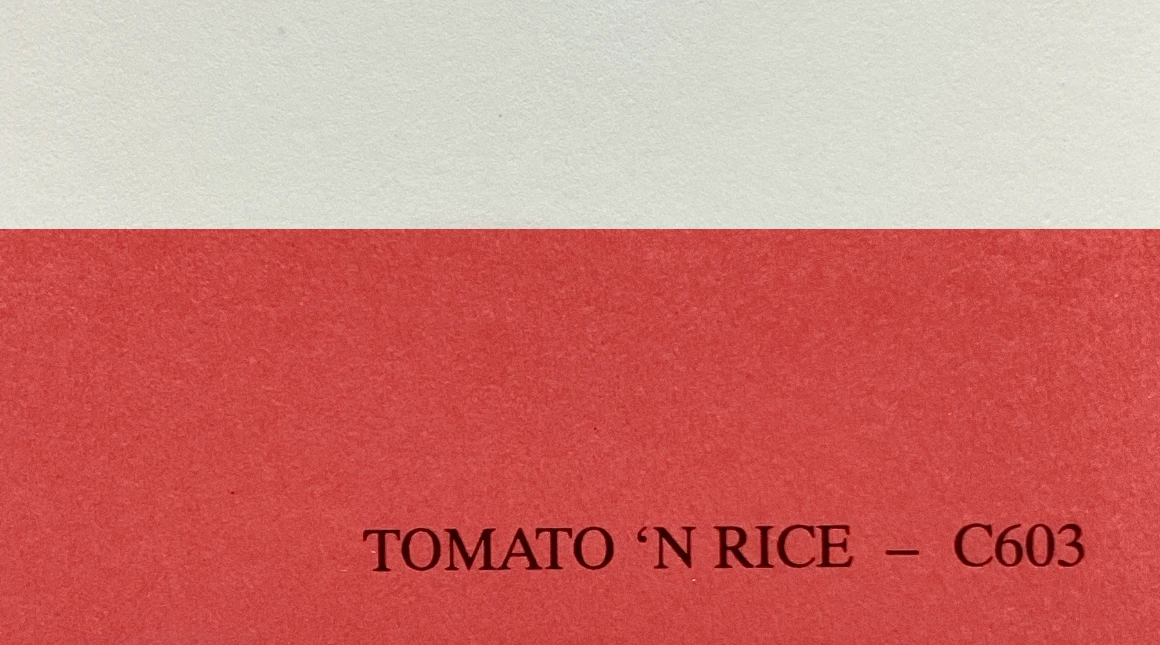 Color: Tomato ‘N Rice (C603) — A vibrant, savory red paired with a clean, neutral cream/white reverse.